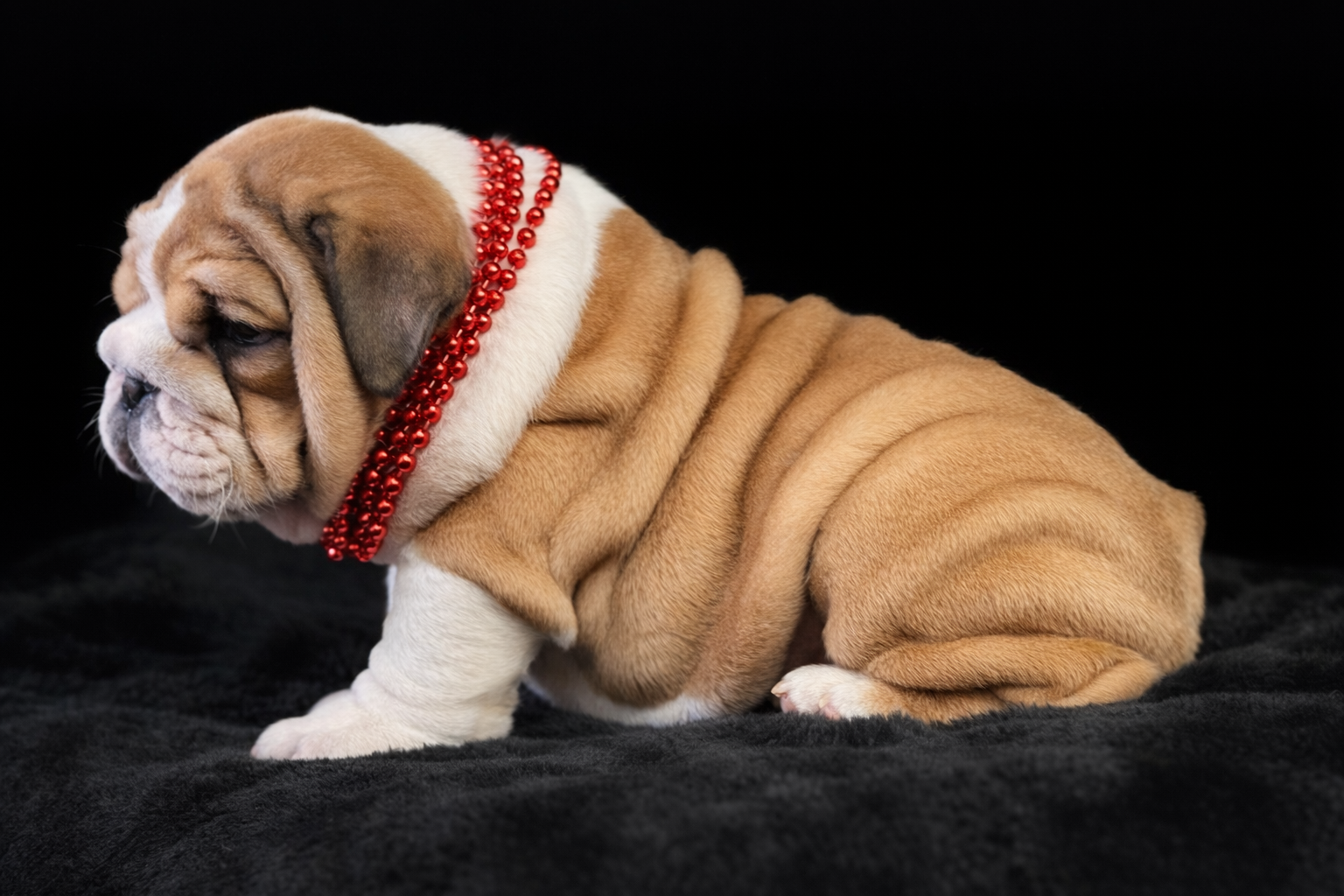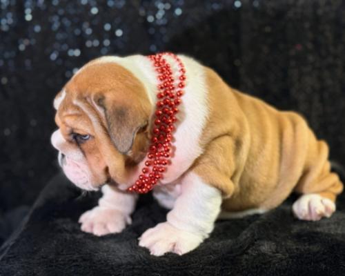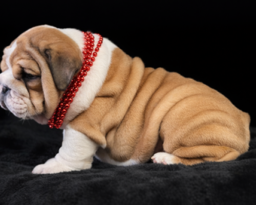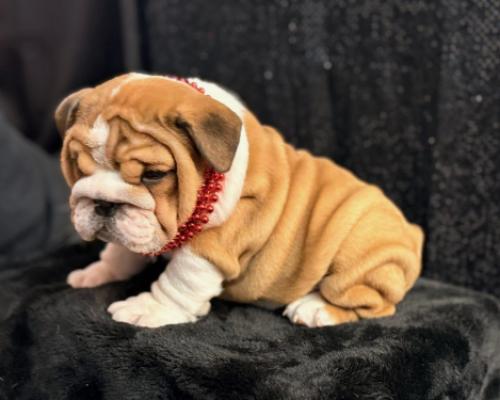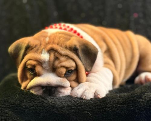 Meet Blitz, an adorable English Bulldog puppy who perfectly embodies the breed's "sourmug" charm. With his tan-and-white coat and rolls of velvety skin, he looks like a tiny, lovable gargoyle. His soulful, slightly skeptical expression and blue beaded collar give him a distinguished yet playful vibe. Blitz is a stout little heartbreaker, clearly ready for naps and endless cuddles.