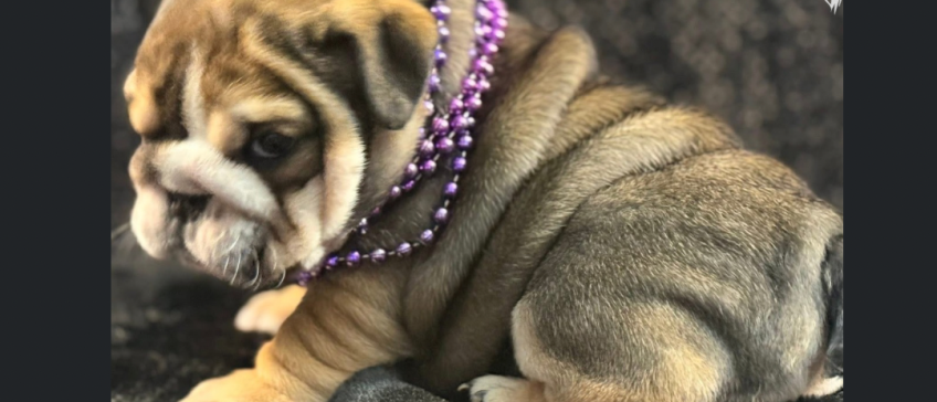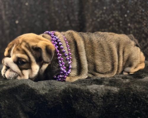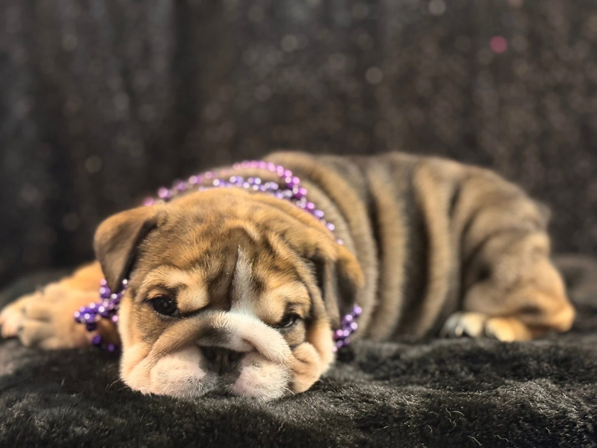 Meet Bree, a stunning English Bulldog puppy who is the definition of "wrinkle goals." Her beautiful brindle-and-tan coat is draped in soft, velvety folds that make her look absolutely huggable. Wearing a regal purple beaded necklace, she has a quiet, thoughtful expression that balances her chunky, playful build. Bree is a little masterpiece of squishy, puppy-sized perfection.