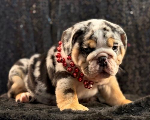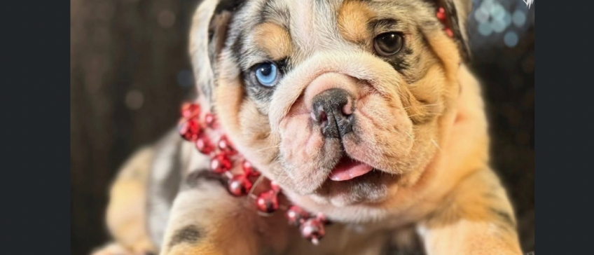 Prepare to fall in love with Madden, a truly extraordinary English Bulldog puppy who stands out in any crowd. His most captivating feature is his striking blue eye, which creates a mesmerizing contrast against his beautifully patterned merle coat. Madden’s look is perfectly topped off with his playful red beads and that irresistible, tiny tongue-peek that shows off his charming personality.