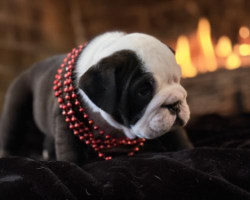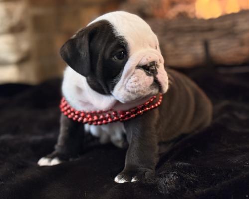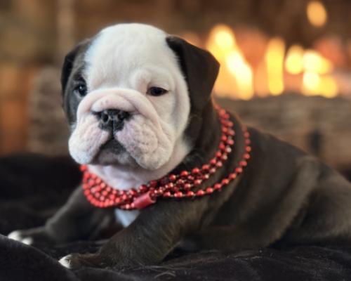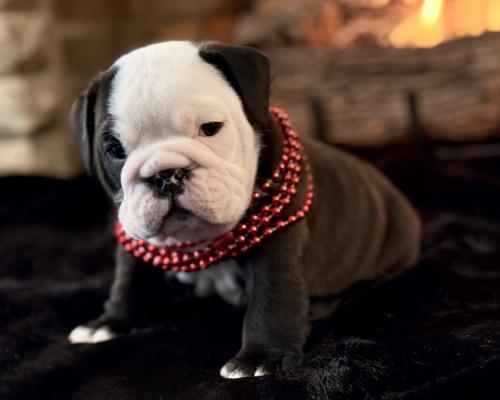 Meet Bandit, the little charmer who is ready to steal your heart! This English Bulldog puppy is a total standout with his striking black and white coat and that perfectly squishy, wrinkled face. Sporting a dapper set of red beads, Bandit has a gaze that is both soulful and sweet, making it impossible not to fall in love at first sight.