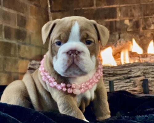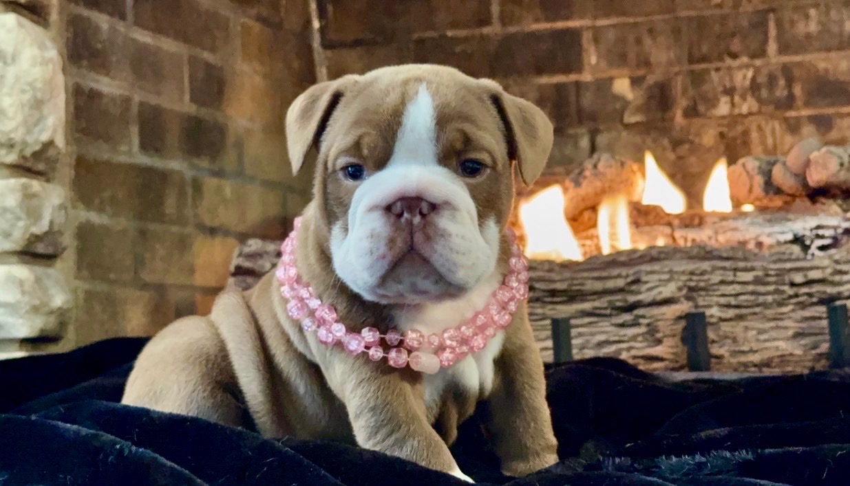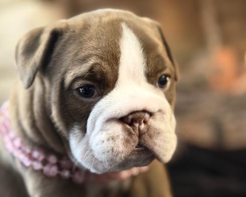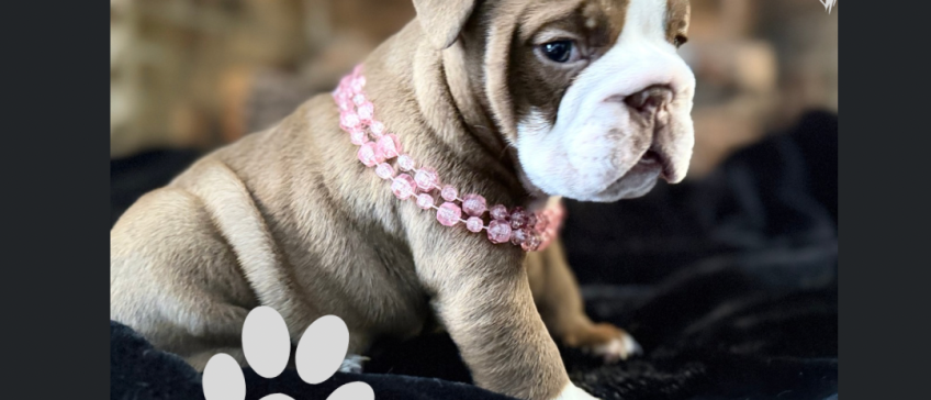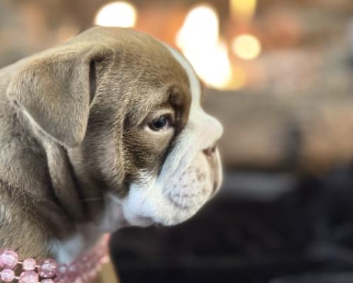 Meet Chocolate, the darling English Bulldog puppy who is ready to steal your heart! With her stunning cocoa-colored coat and those signature soulful eyes, she is the perfect blend of chunky, wrinkly, and sweet. Whether she’s sporting her favorite pink pearls or curling up for a nap by the fire, her calm and affectionate temperament shines through.