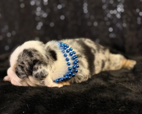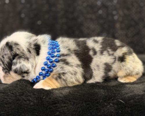 • Unique Markings: His striking merle coat and perfectly symmetrical facial mask make him a rare find.