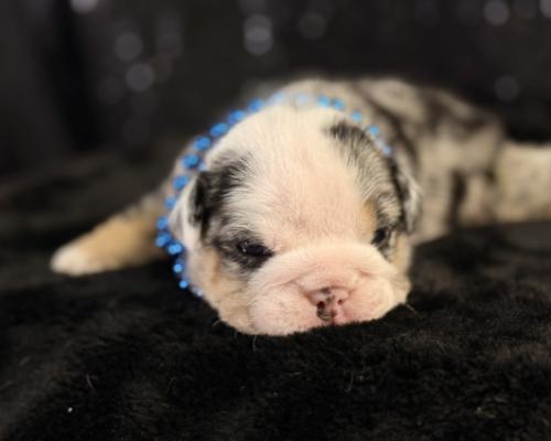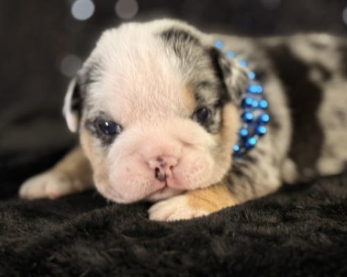 Meet Lucky, the handsome little gentleman who is ready to bring a lifetime of good fortune to your home! Sporting a dapper blue bead collar, Lucky is a breathtaking blue merle English Bulldog with a face that defines "picture perfect." Between those chunky paws and his beautifully marbled coat, he is a total head-turner.