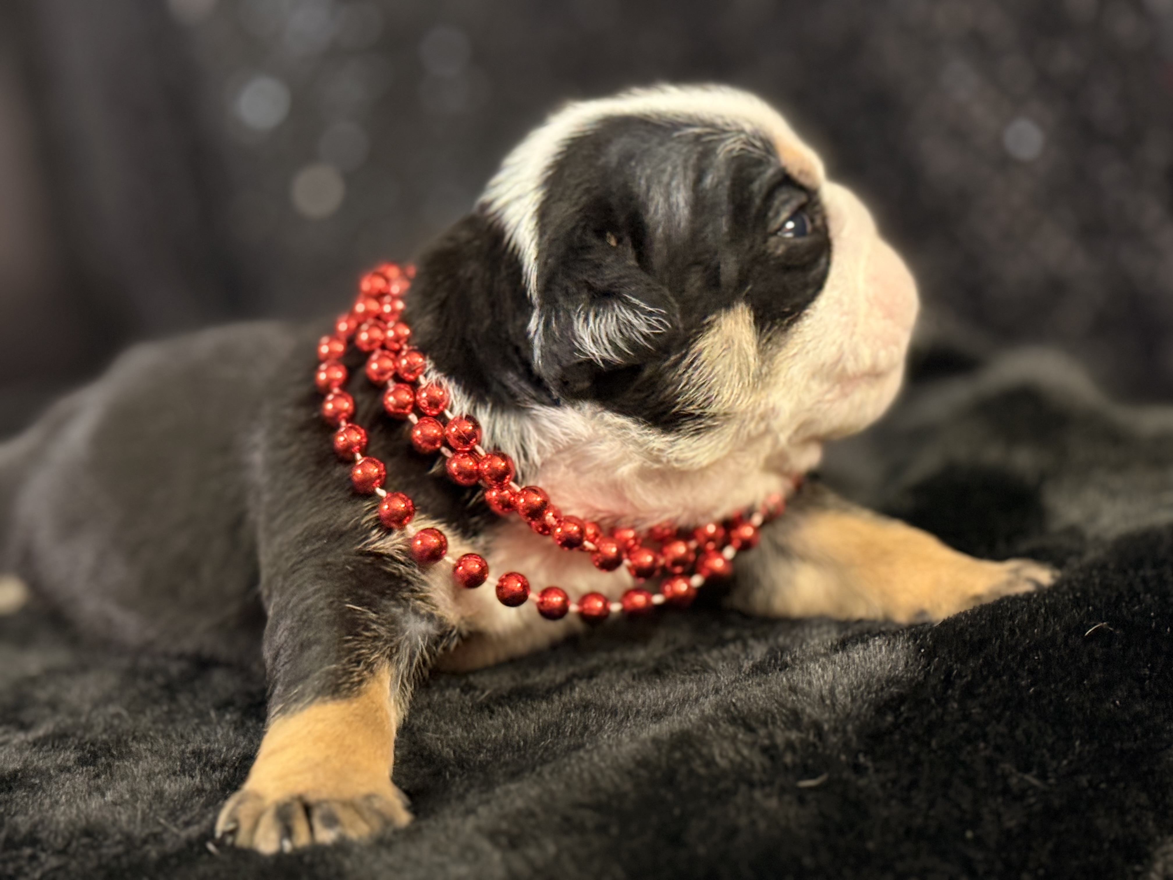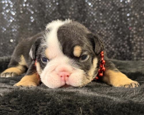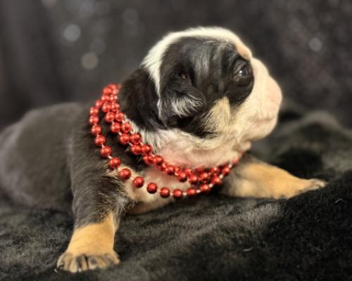 Meet Luster, the tiny treasure who is ready to bring a spark of joy into your life! This striking Black Tri English Bulldog puppy is a true classic with a modern twist. Wearing his festive red bead collar, he shows off deep, rich coat colors contrasted by those signature tan points and a crisp white blaze that makes his sweet face absolutely pop.