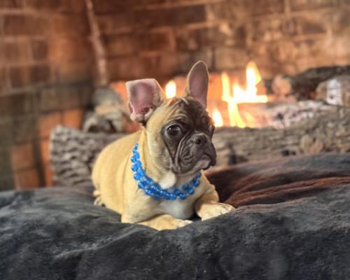 Meet Kade, a stunning French Bulldog puppy who is ready to bring a spark of joy into your home. With his expressive eyes and distinguished brindle markings, Kade is a natural in front of the camera and an even better companion in person. Pictured here in his stylish blue beads, he already has the personality of a little star who knows how to relax in style.