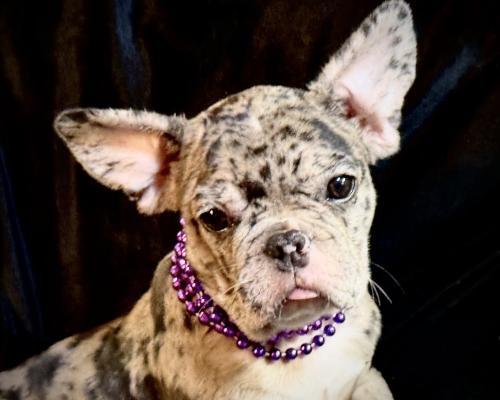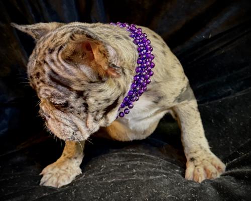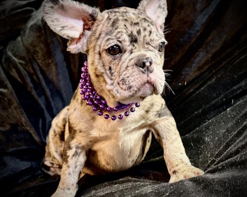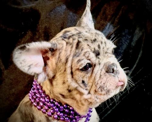 This adorable Merle French Bulldog puppy, Kimmy, is ready to steal your heart. She has stunning coat markings, enormous expressive eyes, and the playful, loving personality Frenchies are famous for. Kimmy is comes fully vetted with papers and ready to be with her furever family! Don't miss out on this sweet, rare beauty—she's the perfect addition to your family!