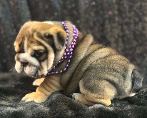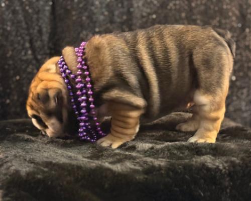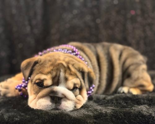 Meet Bree, a stunning English Bulldog puppy who is the definition of "wrinkle goals." Her beautiful brindle-and-tan coat is draped in soft, velvety folds that make her look absolutely huggable. Wearing a regal purple beaded necklace, she has a quiet, thoughtful expression that balances her chunky, playful build. Bree is a little masterpiece of squishy, puppy-sized perfection.