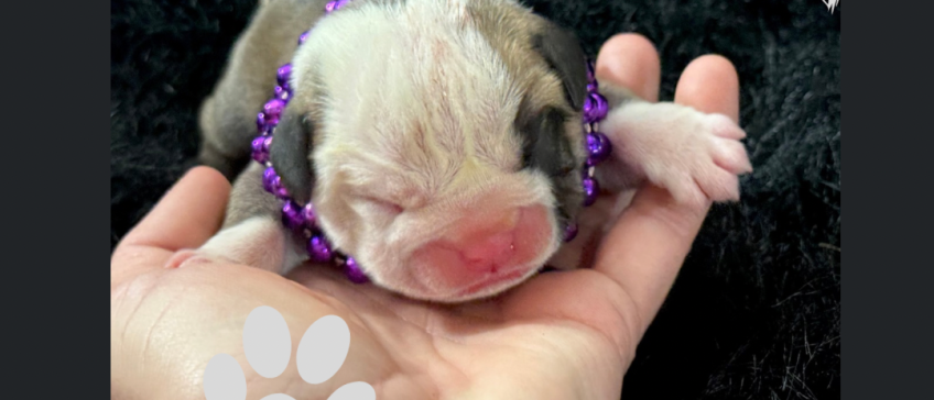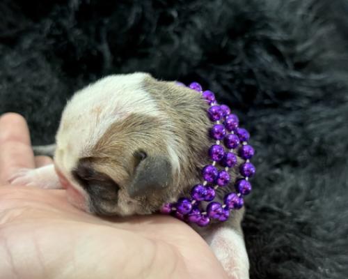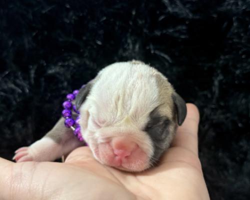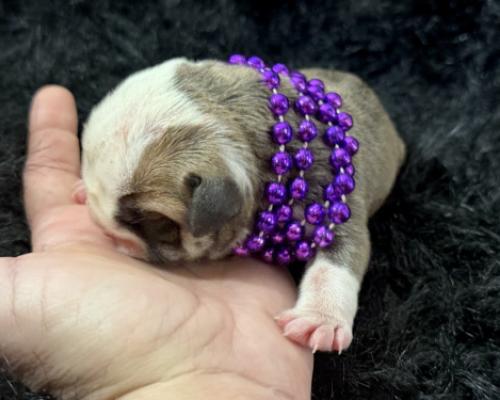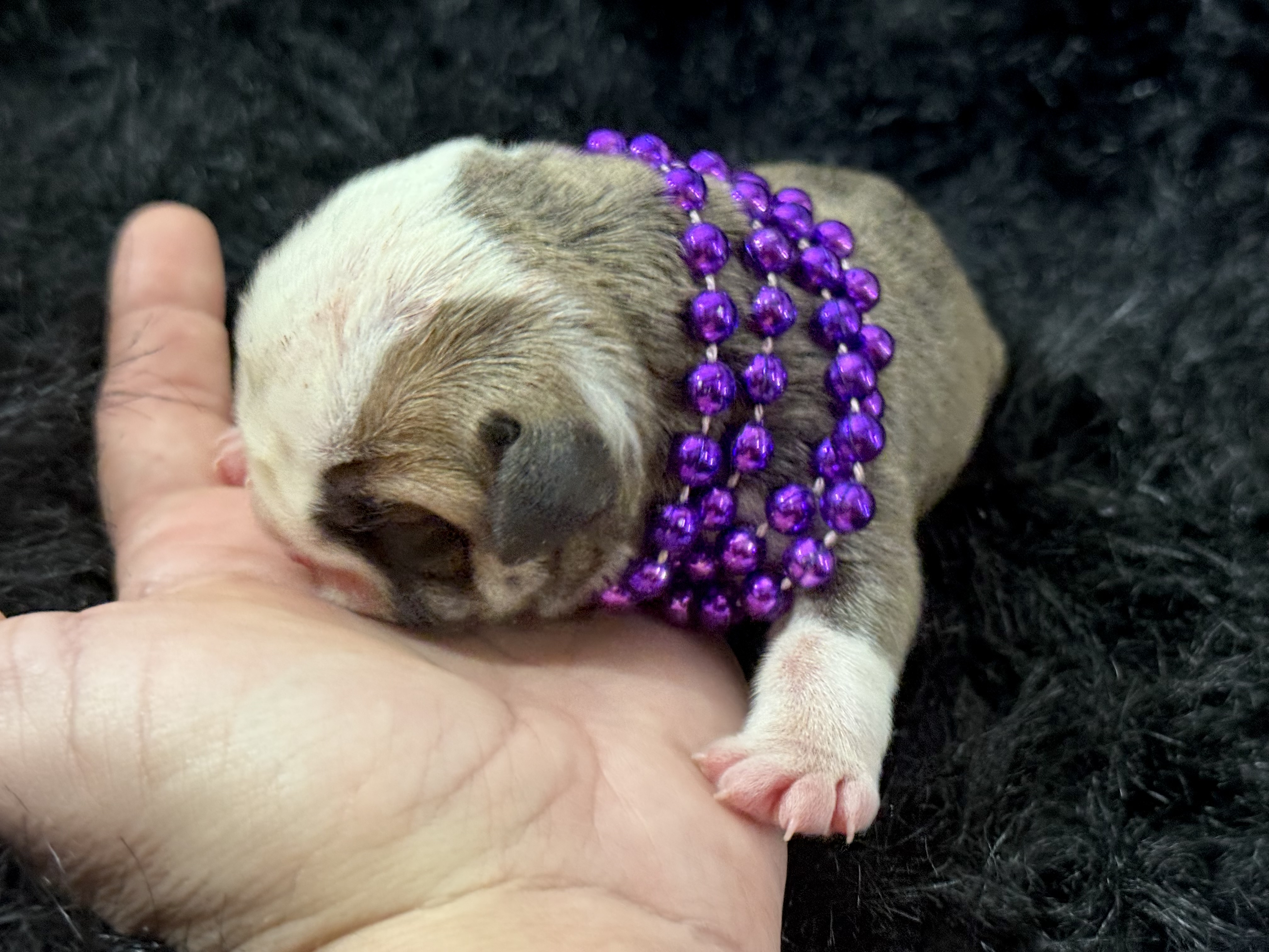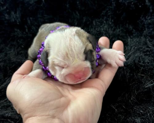Oh my goodness, meet Opal, a tiny bundle of love! This adorable English bulldog puppy, features a beautiful merle coat!