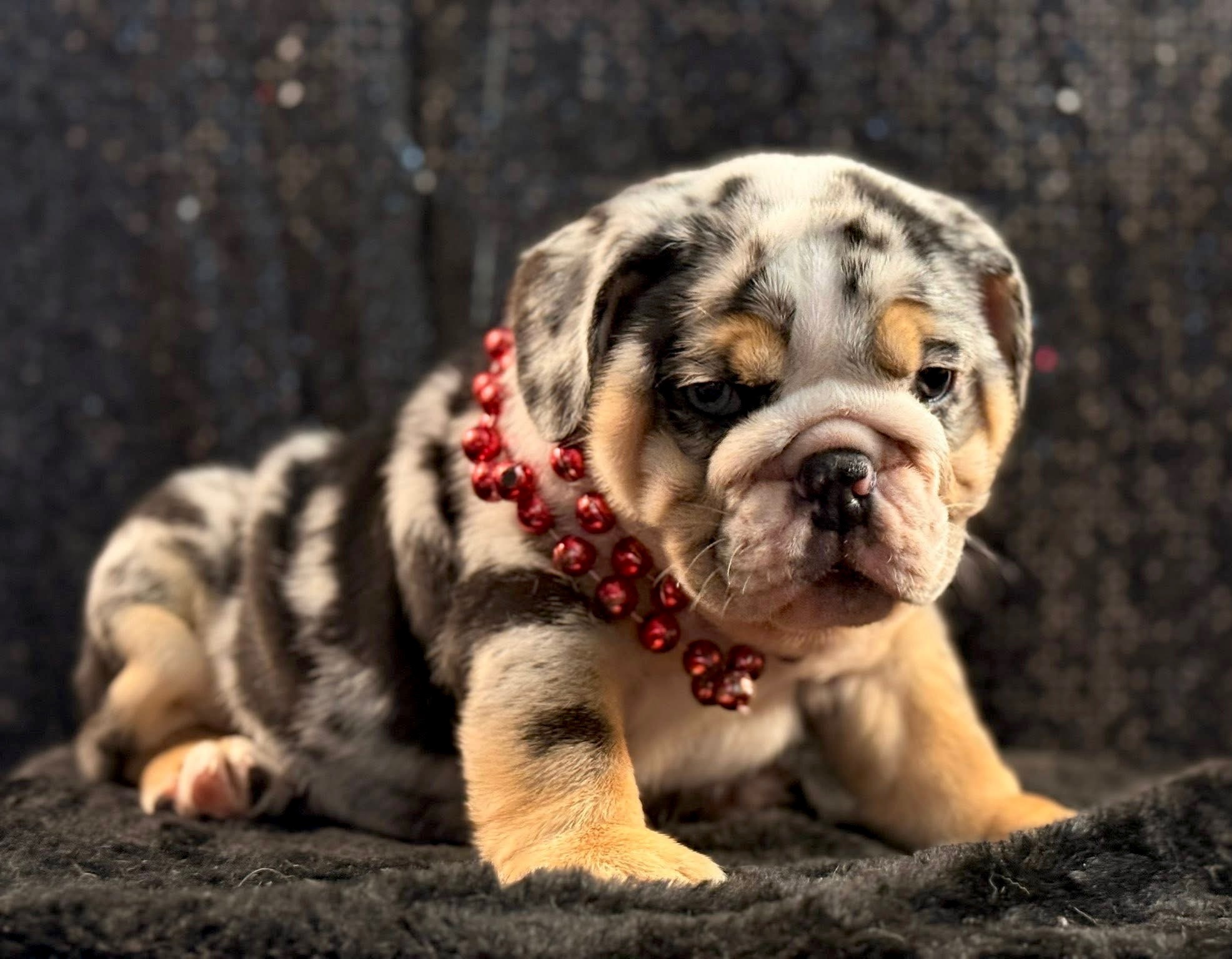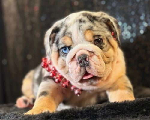 Prepare to fall in love with Madden, a truly extraordinary English Bulldog puppy who stands out in any crowd. His most captivating feature is his striking blue eye, which creates a mesmerizing contrast against his beautifully patterned merle coat. Madden’s look is perfectly topped off with his playful red beads and that irresistible, tiny tongue-peek that shows off his charming personality.
