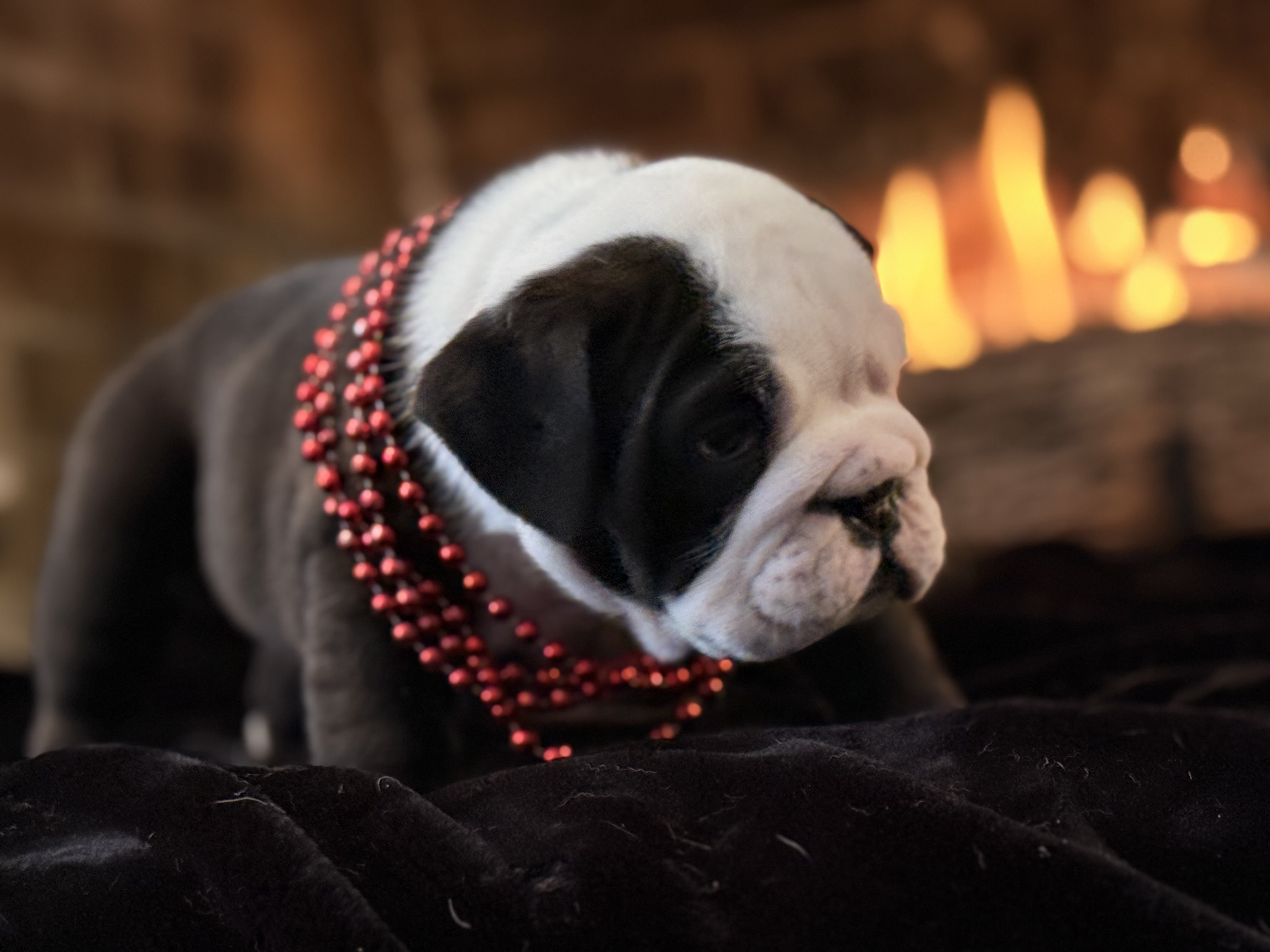 Meet Bandit, the little charmer who is ready to steal your heart! This English Bulldog puppy is a total standout with his striking black and white coat and that perfectly squishy, wrinkled face. Sporting a dapper set of red beads, Bandit has a gaze that is both soulful and sweet, making it impossible not to fall in love at first sight.
