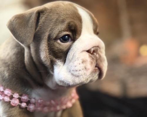 Meet Chocolate, the darling English Bulldog puppy who is ready to steal your heart! With her stunning cocoa-colored coat and those signature soulful eyes, she is the perfect blend of chunky, wrinkly, and sweet. Whether she’s sporting her favorite pink pearls or curling up for a nap by the fire, her calm and affectionate temperament shines through.