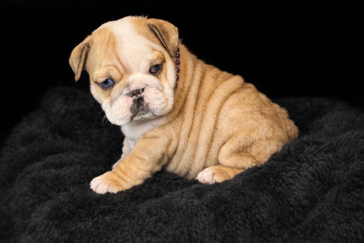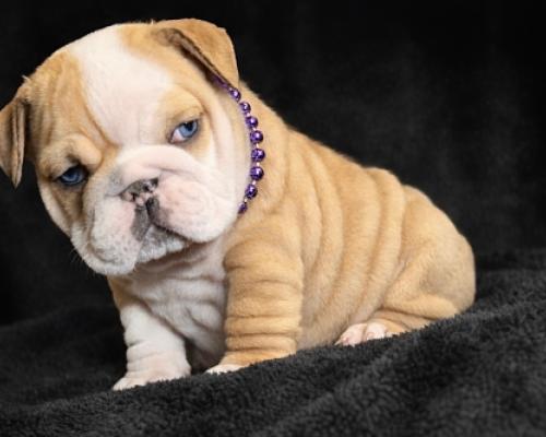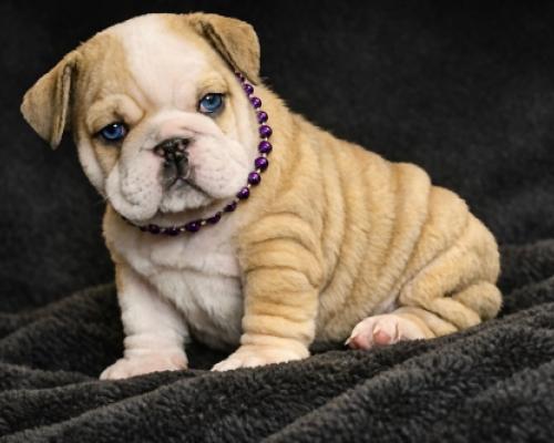 Meet Macie, the absolute crown jewel of English Bulldog puppies! With her striking, soul-piercing blue eyes and those iconic, velvety wrinkles, she is a true "showstopper" who is guaranteed to turn heads wherever she goes. Her unique fawn-and-white coat is as soft as it is beautiful, making her the ultimate cuddle companion for your lazy Sunday afternoons.
