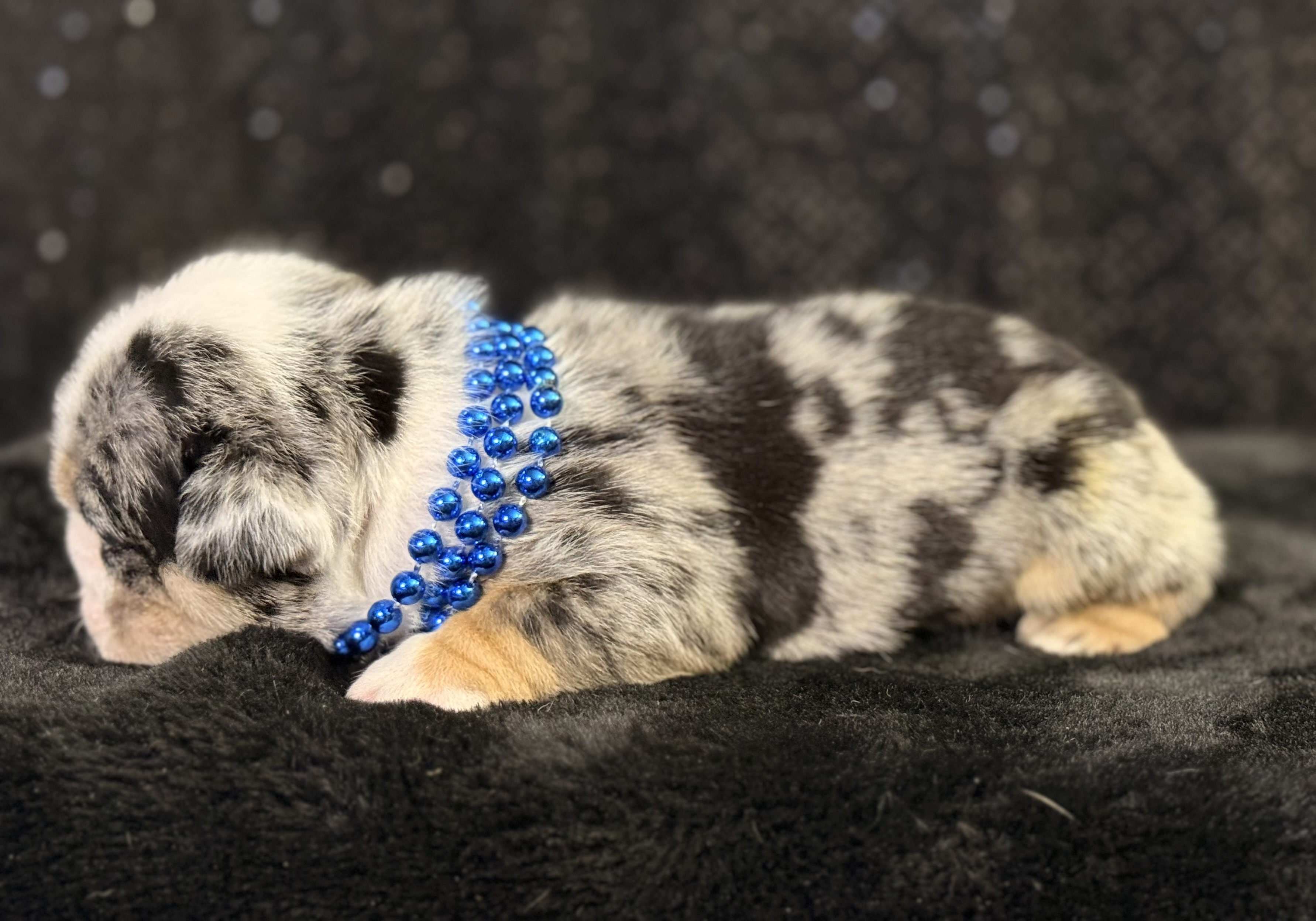 • Unique Markings: His striking merle coat and perfectly symmetrical facial mask make him a rare find.