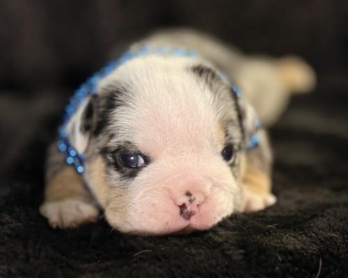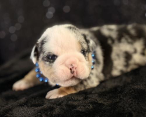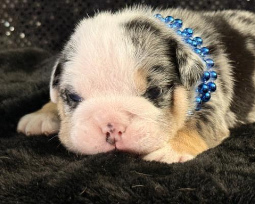 Meet Lucky, the handsome little gentleman who is ready to bring a lifetime of good fortune to your home! Sporting a dapper blue bead collar, Lucky is a breathtaking blue merle English Bulldog with a face that defines "picture perfect." Between those chunky paws and his beautifully marbled coat, he is a total head-turner.