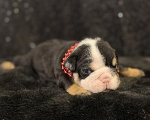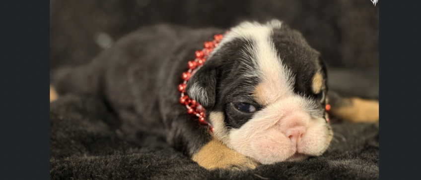 Meet Luster, the tiny treasure who is ready to bring a spark of joy into your life! This striking Black Tri English Bulldog puppy is a true classic with a modern twist. Wearing his festive red bead collar, he shows off deep, rich coat colors contrasted by those signature tan points and a crisp white blaze that makes his sweet face absolutely pop.